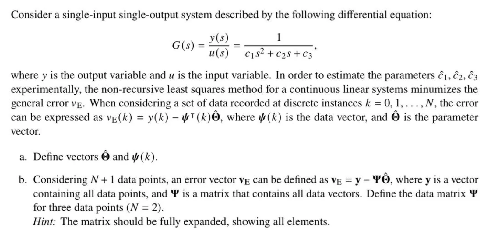 Consider a single-input single-output system described by the following differential equation: G(s) = y(s)/u(s) = 1 / (c1s² + c2s + c3), where y is the output variable and u is the input variable. In order to estimate the parameters ĉ1, ĉ2, ĉ3 experimentally, the non-recursive least squares method for a continuous linear systems minimizes the general error vE. When considering a set of data recorded at discrete instances k = 0, 1, ..., N, the error can be expressed as vE(k) = y(k) - ψ^T(k)θ̂, where ψ(k) is the data vector, and θ̂ is the parameter vector. a. Define vectors θ̂ and ψ(k). b. Considering N + 1 data points, an error vector vE can be defined as vE = y - Ψθ̂, where y is a vector containing all data points, and Ψ is a matrix that contains all data vectors. Define the data matrix Ψ for three data points (N = 2). Hint: The matrix should be fully expanded, showing all elements.