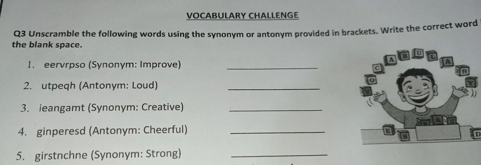 Vocabulary Challenge Q3: Unscramble the following words using the synonym or antonym provided in brackets. Write the correct word in the blank space.