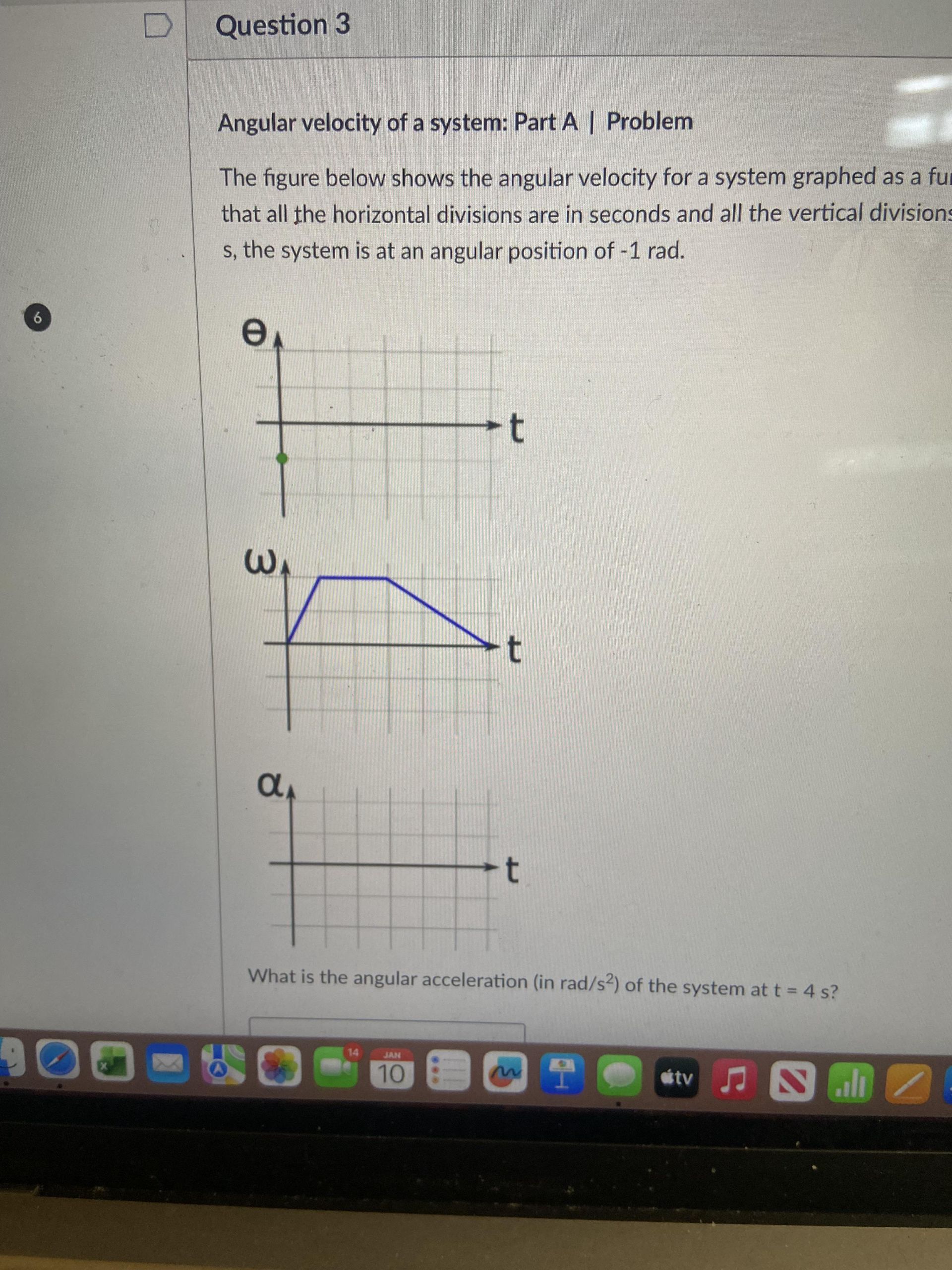 Angular velocity of a system: Part A | Problem The figure below shows the angular velocity for a system graphed as a function where all horizontal divisions are in seconds and all vertical divisions are in rad/s. At t = 4 s, the system is at an angular position of -1 rad. What is the angular acceleration (in rad/s²) of the system at t = 4 s?
